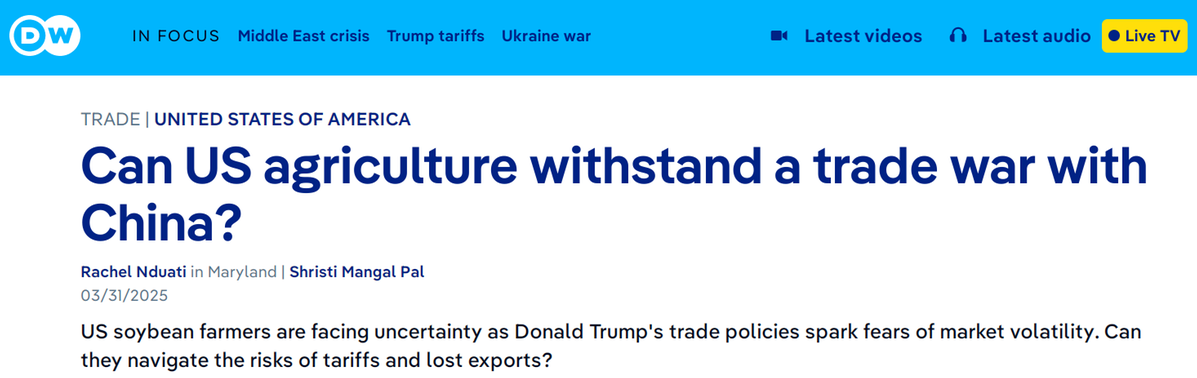 德國(guó)之聲3月31日?qǐng)?bào)道稱(chēng),特朗普的貿(mào)易政策引發(fā)市場(chǎng)動(dòng)蕩擔(dān)憂,美國(guó)大豆種植戶面臨巨大的不確定性。美國(guó)大豆出口,特別是對(duì)華出口,多年來(lái)一直在下降。特朗普貿(mào)易政策對(duì)農(nóng)民的全面影響可能要等到下一個(gè)收獲季才會(huì)完全顯現(xiàn)。