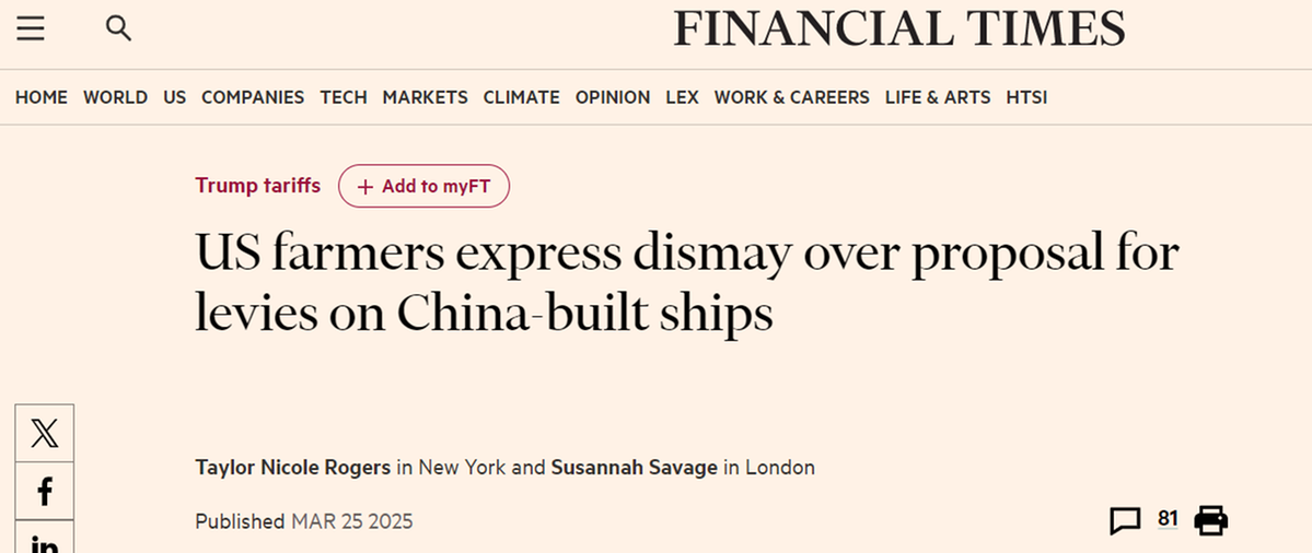 另?yè)?jù)英國(guó)《金融時(shí)報(bào)》報(bào)道,美國(guó)中西部農(nóng)民非常擔(dān)憂,加征“港口費(fèi)”必將進(jìn)一步削弱農(nóng)產(chǎn)品出口競(jìng)爭(zhēng)力。美國(guó)大豆出口委員會(huì)首席執(zhí)行官吉姆·薩特表示,整個(gè)行業(yè)對(duì)提案“措手不及”。