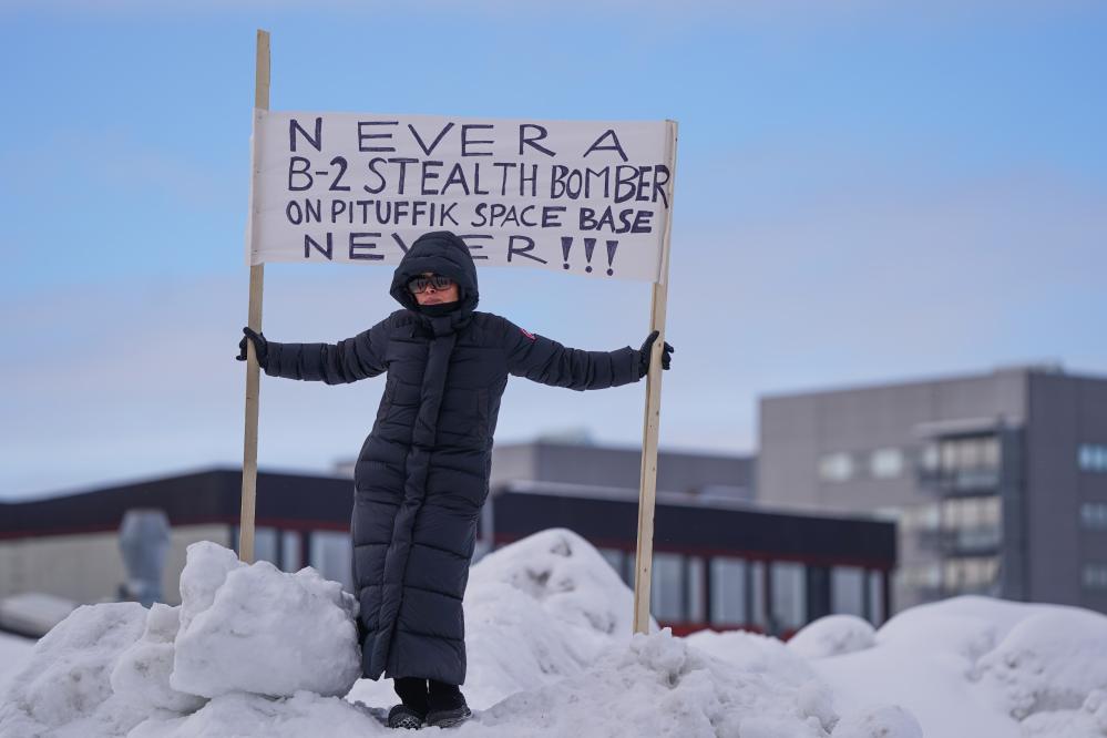 3月28日,美國副總統(tǒng)萬斯訪問位于格陵蘭島北部的美國皮圖菲克太空基地。圖為一名女子當(dāng)天在格陵蘭島首府努克手舉標(biāo)語對(duì)此表示抗議。新華社記者 彭子洋 攝