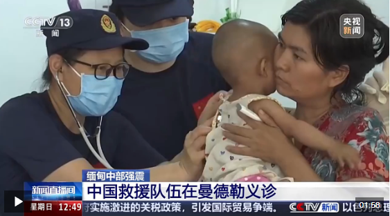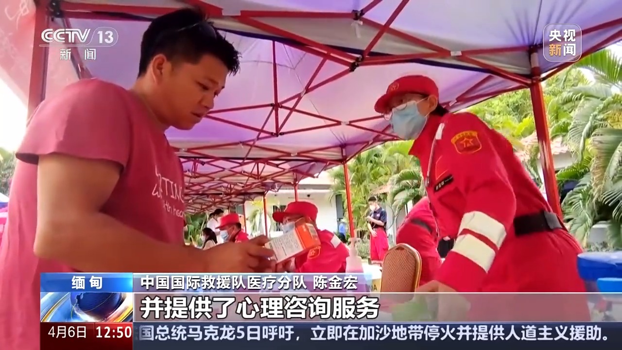 總臺央視記者 唐國榮:這里是緬甸曼德勒的多金堰地區(qū),來自中國救援隊、中國國際救援隊和中國香港救援隊的醫(yī)療隊員們,來到這里為緬甸地震中受災(zāi)的人員開展各種醫(yī)療救助服務(wù)。