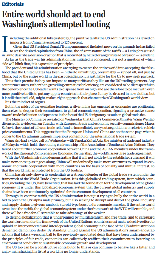 美國政府試圖脅迫全世界接受這樣一個謊言,即美國在過去幾十年中不僅被中國,而且被整個世界所欺騙,因此美國現(xiàn)在加征關(guān)稅是理所當(dāng)然的。其他國家如果不卑躬屈膝地請求“寬大處理”,甚至采取反制措施,就會被視為對美方大不敬,美國將加以更高的懲罰性關(guān)稅,迫使敢于反抗的國家俯首稱臣。華盛頓的世界觀也許披上了新衣,但仍然是老套的“強權(quán)即公理”,完全是流氓心態(tài)和強盜邏輯。