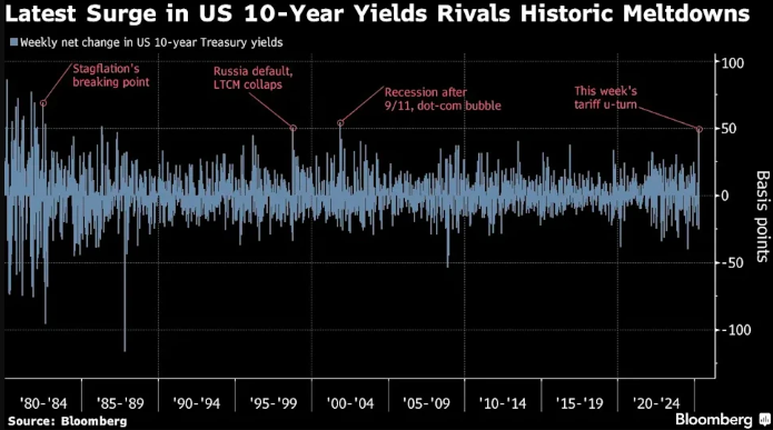 這一基準(zhǔn)收益率在過(guò)去短短五天內(nèi)飆升了逾50個(gè)基點(diǎn)至4.49%——上一次出現(xiàn)如此猛烈的單周漲幅,還要追溯到2001年“911”恐怖襲擊發(fā)生之時(shí)。