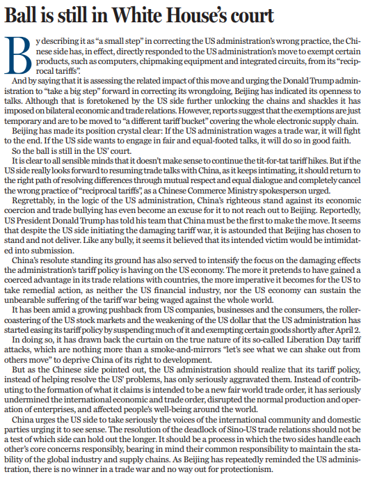 理智之人不難看出,繼續(xù)針鋒相對地加征關(guān)稅已然毫無實(shí)際意義。如果美方真如其所暗示的那樣,期待與中國重啟談判,就應(yīng)像中國商務(wù)部新聞發(fā)言人所敦促的那樣,徹底取消“對等關(guān)稅”的錯(cuò)誤做法,回到相互尊重,通過平等對話解決分歧的正確道路上來。