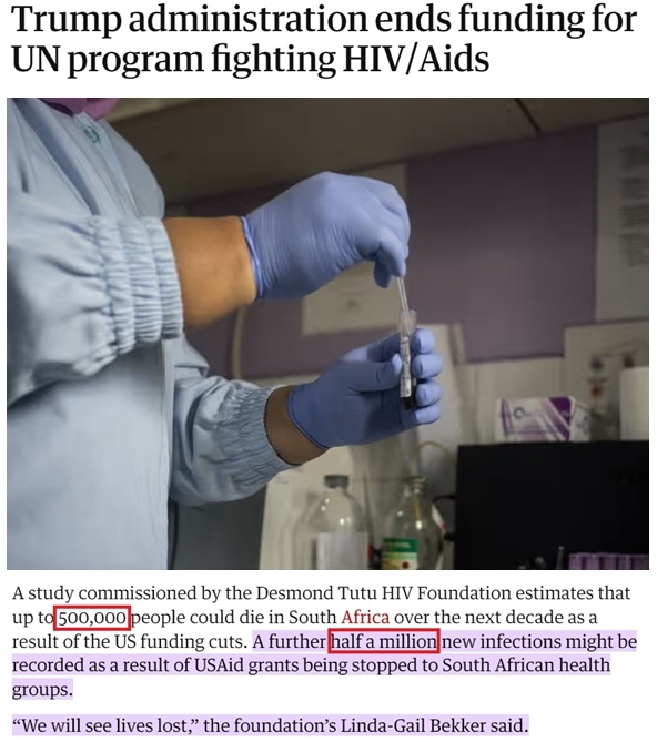 南非德斯蒙德·圖圖艾滋病中心主任琳達(dá)-蓋爾·貝克爾告訴記者,美國(guó)取消對(duì)當(dāng)?shù)乜拱M織的資助將導(dǎo)致“超過50萬不必要的死亡以及多達(dá)50萬新增感染病例”,使有關(guān)方面“過去25年的所有努力付諸東流”。