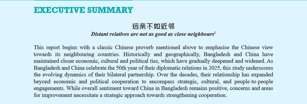 報(bào)告說,75%的受訪者對(duì)孟加拉國與中國的關(guān)系持正面看法,與此同時(shí),僅2%的受訪者對(duì)華關(guān)系持負(fù)面看法。