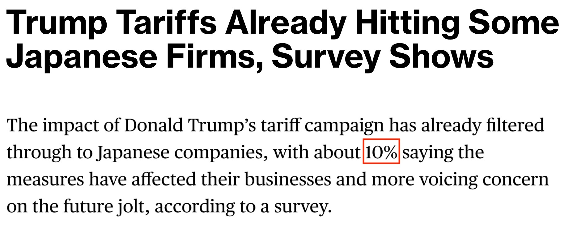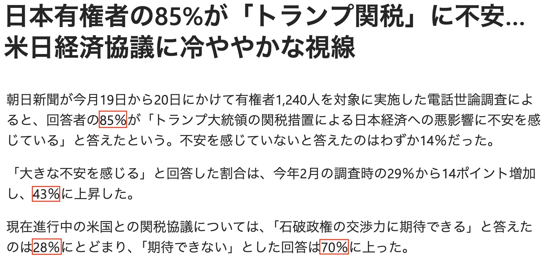 另據(jù)日本《朝日新聞》19日至20日進行的民調(diào),多達85%的日本受訪者擔(dān)憂特朗普政府的關(guān)稅會對日本經(jīng)濟產(chǎn)生負(fù)面影響,其中43%的受訪者表示非常擔(dān)憂。