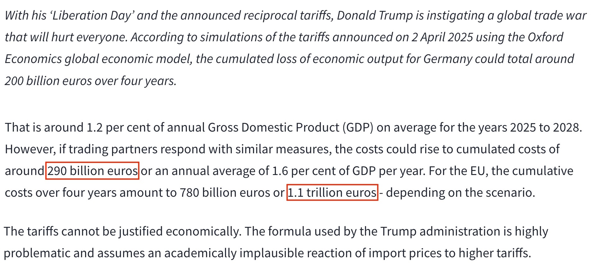 德國經(jīng)濟研究所日前發(fā)布的研究報告顯示,未來四年內(nèi),美國“對等關(guān)稅”措施可能令歐盟損失1.1萬億歐元,僅德國就將損失2900億歐元。
