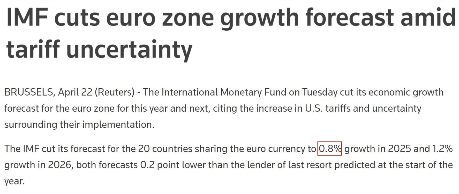 根據(jù)國際貨幣基金組織22日發(fā)布的最新一期《世界經(jīng)濟展望報告》,受美國關(guān)稅措施沖擊和政策不確定性的影響,今年歐元區(qū)經(jīng)濟增長率預(yù)計將比之前下調(diào)0.2個百分點至0.8%。