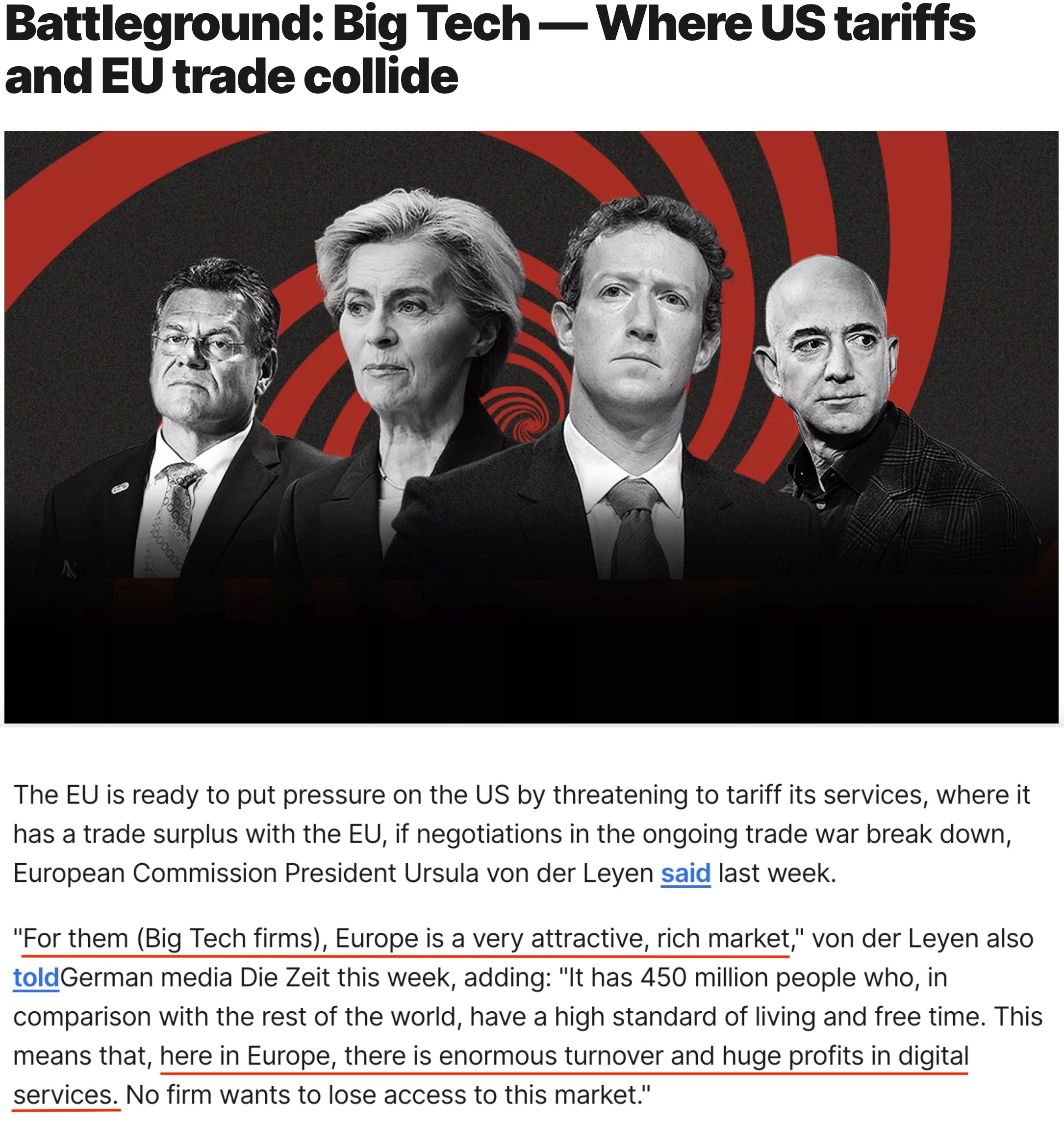 歐盟委員會主席馮德萊恩近日接受歐洲媒體采訪時表示,如果與美國的談判無法讓其取消對歐關(guān)稅,歐盟準(zhǔn)備動用“最有力的貿(mào)易措施”將大西洋兩岸的貿(mào)易戰(zhàn)擴大到服務(wù)領(lǐng)域,包括對美國大型科技公司的數(shù)字廣告收入征稅、限制美國公司參與歐盟公共采購項目等。