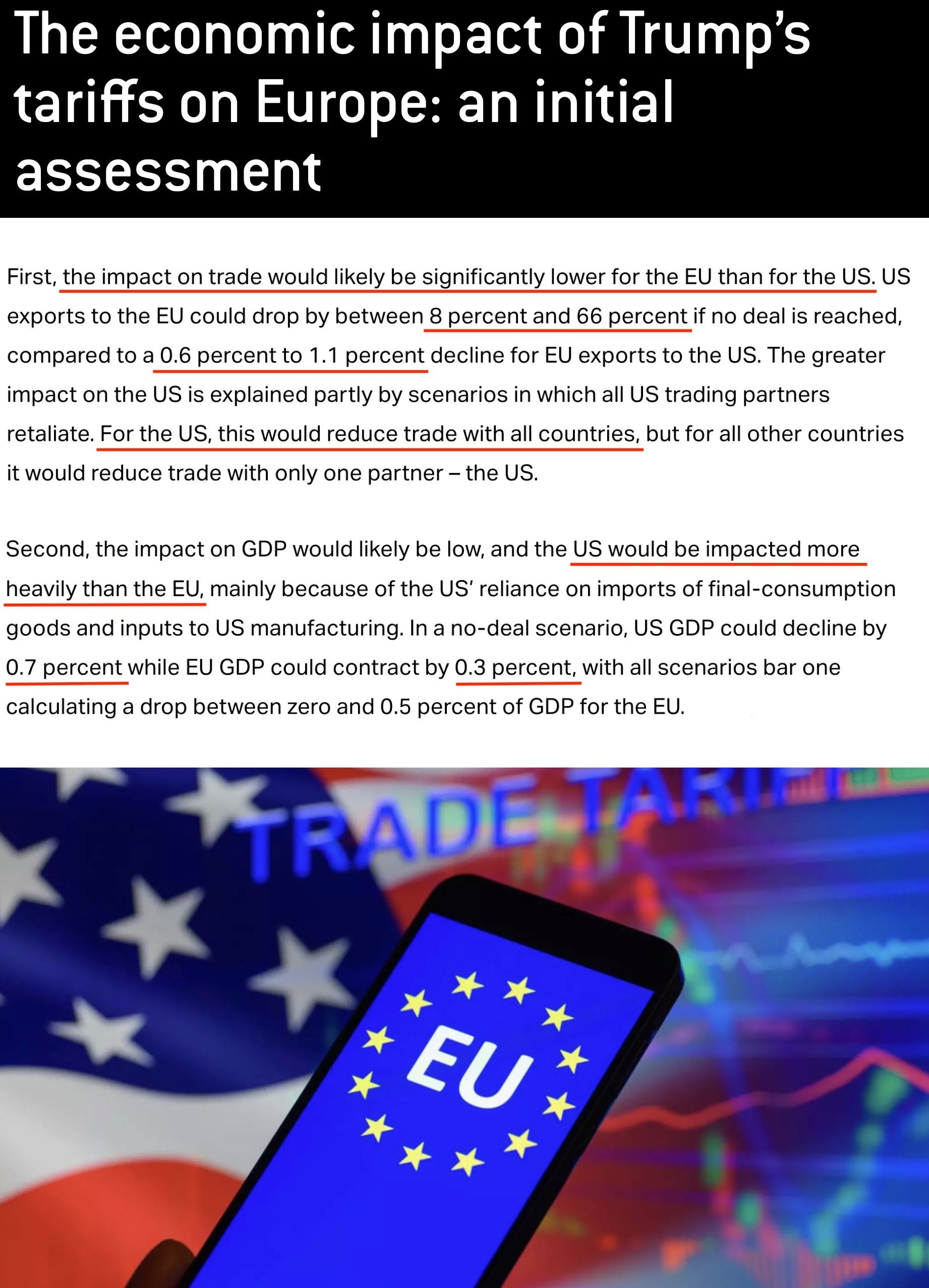 至于關(guān)稅對國內(nèi)生產(chǎn)總值(GDP)的影響,美國也將比歐盟更嚴(yán)重。如果不能與歐盟達成關(guān)稅協(xié)議,美國的GDP可能下降0.7%,而歐盟的GDP則可能僅下降0.3%。