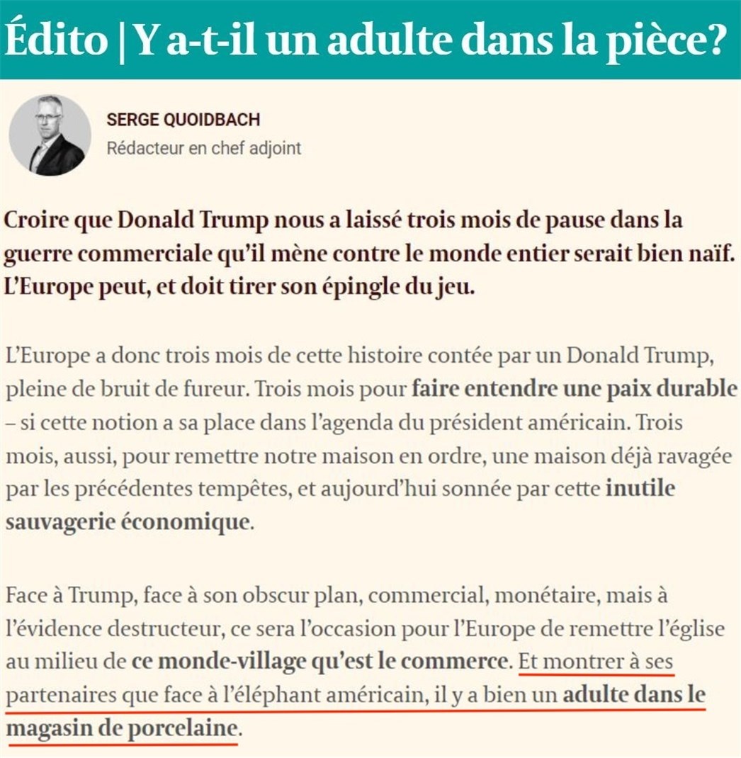 比利時《回聲報》近日發(fā)表評論文章指出,面對反復(fù)無常的特朗普政府,歐洲不應(yīng)存有任何幻想,而應(yīng)“直面美國帶來的喧囂與動蕩”,做好自己的事。