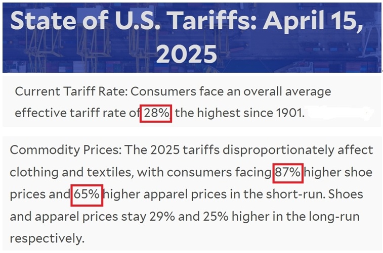 其中,關(guān)稅對(duì)服裝和紡織品價(jià)格的影響尤為明顯,鞋類(lèi)和服裝的價(jià)格短期內(nèi)將分別大幅上漲87%和65%。