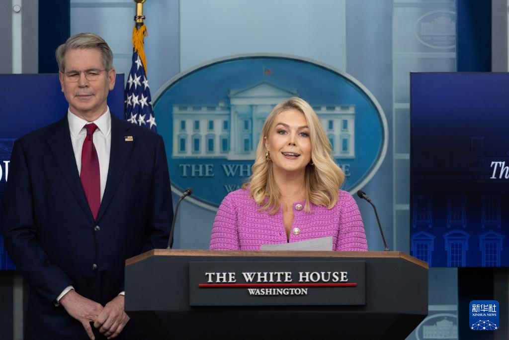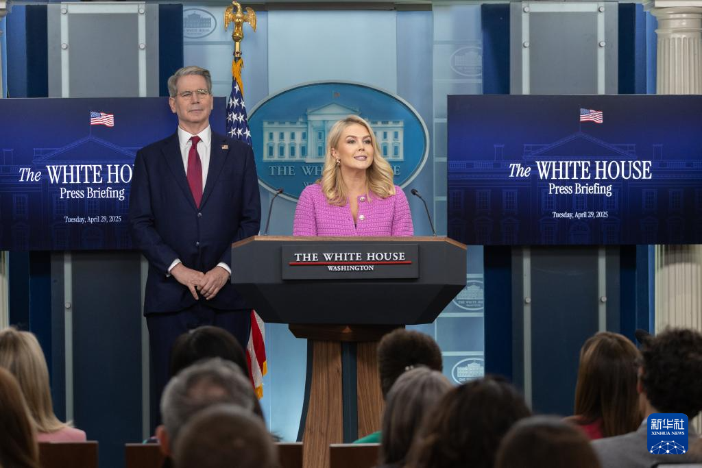 4月29日,美國白宮新聞秘書卡羅琳·萊維特(右)與美國財政部長斯科特·貝森特在華盛頓白宮出席記者會。新華社記者 胡友松 攝