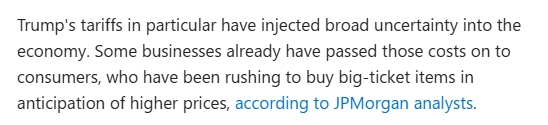 商界領袖們迫切希望美國的政策能有幾周的穩(wěn)定,美國農(nóng)戶們發(fā)現(xiàn)自己的聯(lián)邦食品補貼合同已經(jīng)終止,全美各地的非營利組織都在裁員,因為白宮正在削減開支。尤其是特朗普政府的關稅政策給經(jīng)濟帶來了廣泛的不確定性。摩根大通分析師表示,一些企業(yè)已經(jīng)將這些成本轉(zhuǎn)嫁給了消費者,消費者因預期價格上漲而搶購大件商品。