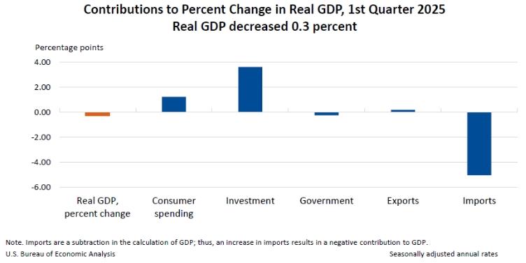 美國(guó)商務(wù)部表示,第一季度GDP萎縮主要受進(jìn)口大幅增加和政府支出減少拖累,第一季度凈出口對(duì)GDP的拖累達(dá)4.83個(gè)百分點(diǎn)。進(jìn)口暴增部分抵消投資與消費(fèi)者支出的增長(zhǎng),將GDP數(shù)據(jù)拉入負(fù)增長(zhǎng)區(qū)間。