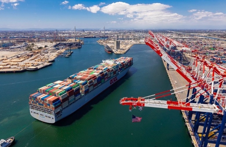 在截至4月25日的一周內(nèi),有十艘集裝箱船抵達(dá)了美國(guó)洛杉磯港和長(zhǎng)灘港,所載貨物達(dá)55.5萬(wàn)噸,這一數(shù)字與去年同期大致相當(dāng)。