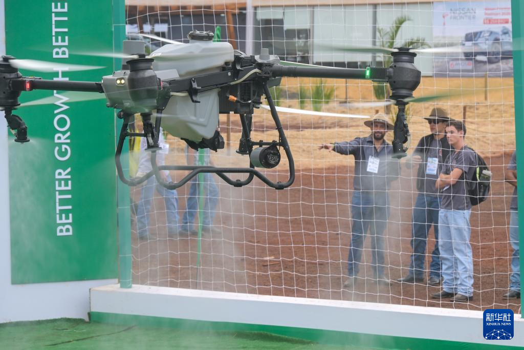 4月29日,在巴西圣保羅州里貝朗普雷圖市舉行的2025年巴西農(nóng)業(yè)科技展上,參觀者觀看大疆農(nóng)業(yè)無(wú)人機(jī)的噴灑演示。新華社記者 陳昊佺 攝