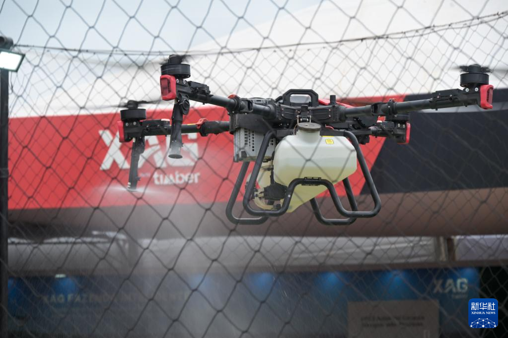 4月29日,在巴西圣保羅州里貝朗普雷圖市舉行的2025年巴西農(nóng)業(yè)科技展上,一架極飛農(nóng)業(yè)無(wú)人機(jī)進(jìn)行噴灑演示。新華社記者 陳昊佺 攝