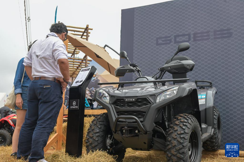 4月29日,在巴西圣保羅州里貝朗普雷圖市舉行的2025年巴西農(nóng)業(yè)科技展上,參觀者觀看春風(fēng)動(dòng)力展示的全地形車(chē)。新華社記者 陳昊佺 攝