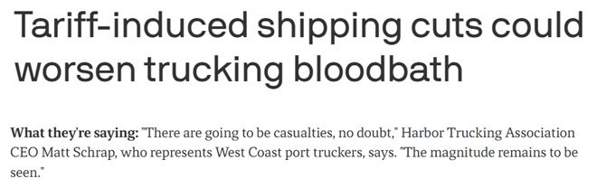 港口卡車運(yùn)輸協(xié)會首席執(zhí)行官馬特·施拉普表示,關(guān)稅政策若繼續(xù)下去,將嚴(yán)重影響整個物流行業(yè),“卡車公司將失去業(yè)務(wù),倉庫也沒有存儲業(yè)務(wù),甚至連碼頭裝卸工也沒有那么多工作了”。
