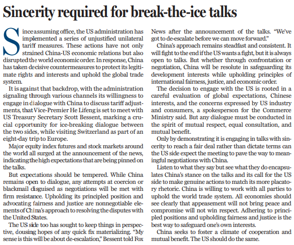 近期,美方不斷表示,希望同中方就關(guān)稅調(diào)整進(jìn)行談判。當(dāng)?shù)貢r(shí)間10日上午,中美經(jīng)貿(mào)高層會(huì)談在瑞士日內(nèi)瓦開(kāi)始舉行。中共中央政治局委員、國(guó)務(wù)院副總理何立峰作為中美經(jīng)貿(mào)中方牽頭人,當(dāng)天與美方牽頭人、美國(guó)財(cái)長(zhǎng)貝森特舉行會(huì)談。中美關(guān)稅戰(zhàn)迎來(lái)破冰契機(jī)。