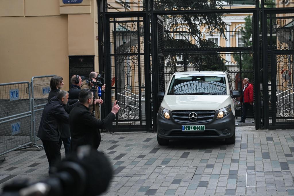 4月10日,在土耳其伊斯坦布爾,載有美國(guó)代表的車(chē)輛駛離俄羅斯駐伊斯坦布爾總領(lǐng)館。新華社記者劉磊攝