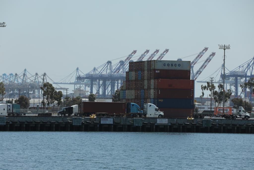 這是4月29日在美國(guó)洛杉磯港拍攝的集裝箱和卡車(chē)。洛杉磯港執(zhí)行董事吉恩·塞羅卡當(dāng)天表示,隨著美國(guó)關(guān)稅政策導(dǎo)致企業(yè)削減進(jìn)口訂單,洛杉磯港下周入境貨運(yùn)量預(yù)計(jì)將比去年同期下跌超過(guò)35%。新華社發(fā)(邱晨攝)