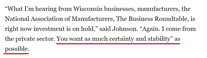 “我從本州的企業(yè)、制造商以及全美制造商協(xié)會(huì)和商業(yè)圓桌會(huì)議那里聽到的消息是,許多外商原定的投資計(jì)劃已經(jīng)被擱置。我本人來自私營企業(yè),我知道企業(yè)最需要的就是盡可能多的確定性和穩(wěn)定性。”