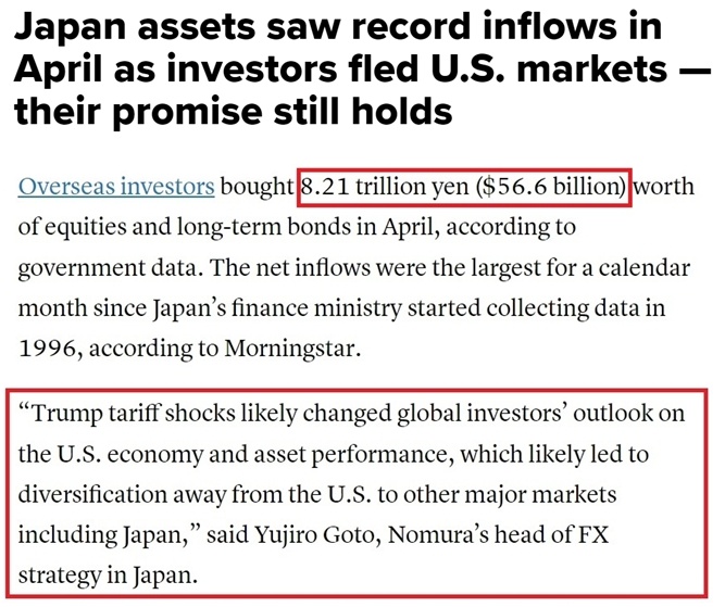 值得注意的是,在日本對(duì)美投資可能被“嚇退”的同時(shí),“逃離”美國的資金正大量涌向日本。