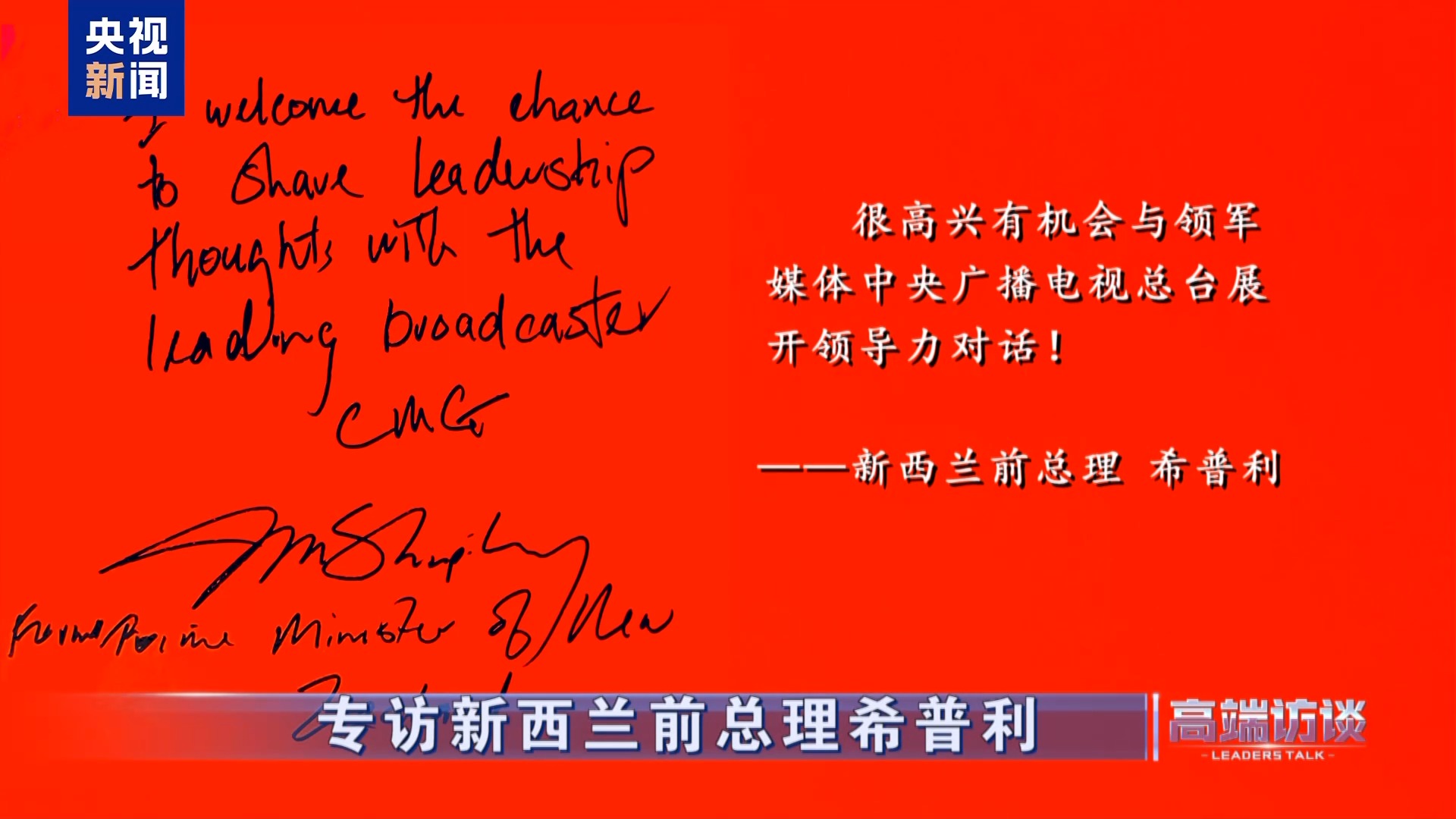 新西蘭前總理希普利在接受總臺專訪后題詞