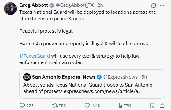 美國(guó)得克薩斯州州長(zhǎng)阿博特10日晚宣布,將在全州部署國(guó)民警衛(wèi)隊(duì),以確?!昂推脚c秩序”。