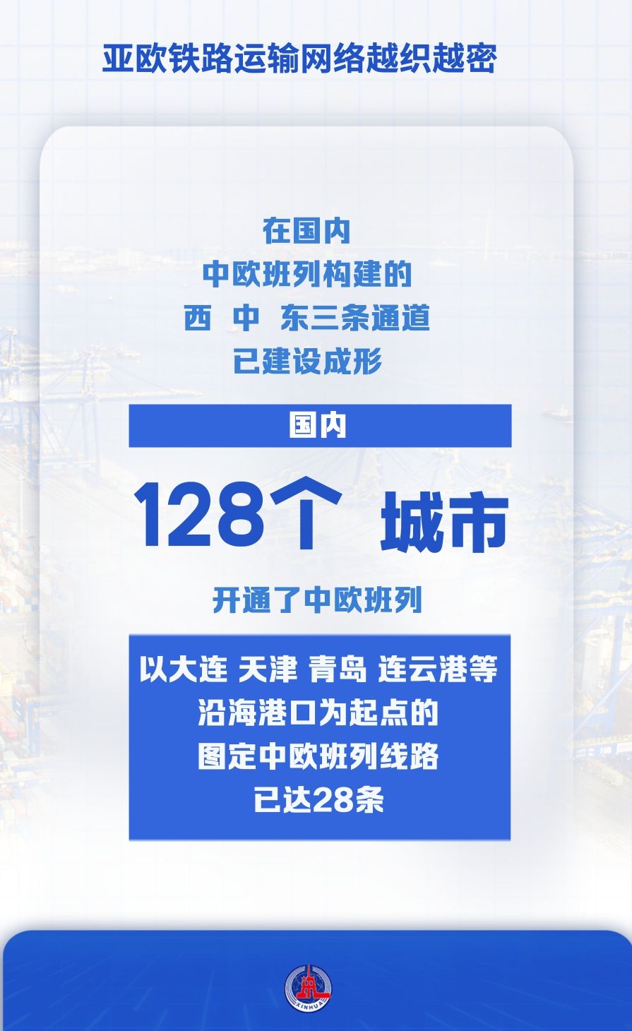 在國(guó)內(nèi),中歐班列構(gòu)建的西、中、東三條通道已建設(shè)成形,國(guó)內(nèi)128個(gè)城市開通了中歐班列,以大連、天津、青島、連云港等沿海港口為起點(diǎn)的圖定中歐班列線路已達(dá)28條。