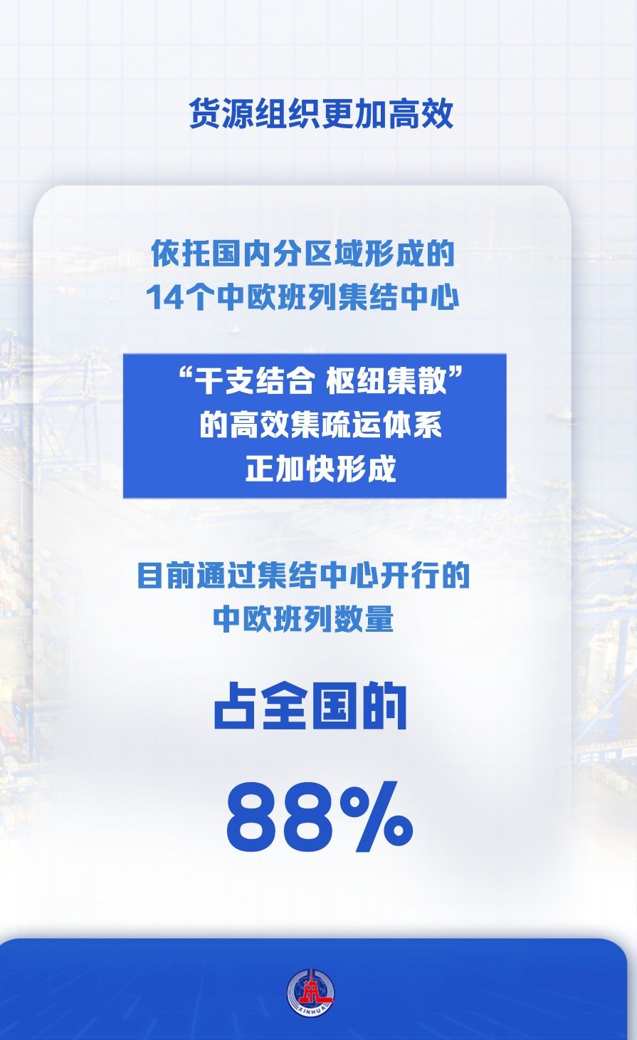 依托國(guó)內(nèi)分區(qū)域形成的14個(gè)中歐班列集結(jié)中心,“干支結(jié)合、樞紐集散”的高效集疏運(yùn)體系正加快形成,目前通過集結(jié)中心開行的中歐班列數(shù)量占全國(guó)的88%。
