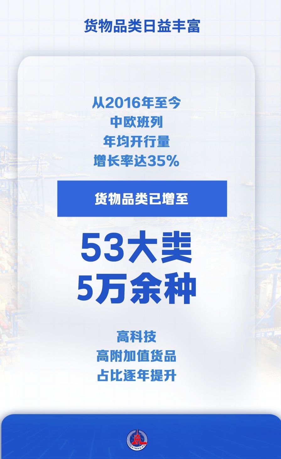 從2016年至今,中歐班列年均開行量增長(zhǎng)率達(dá)35%,貨物品類已增至53大類5萬余種,高科技、高附加值貨品占比逐年提升。