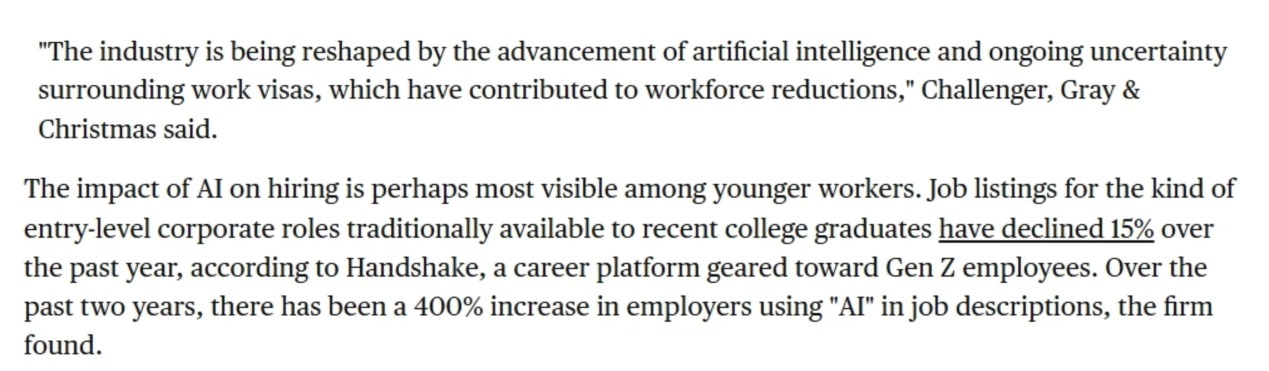 報告分析,人工智能的快速進步與工作簽證政策的不確定性,正在重塑就業(yè)格局。其中,年輕求職者首當其沖。過去一年,美國企業(yè)面向應屆畢業(yè)生的初級職位招聘量下降15%,而招聘要求中提及“人工智能”的崗位數(shù)量卻激增400%,凸顯技能需求結(jié)構(gòu)性轉(zhuǎn)變。