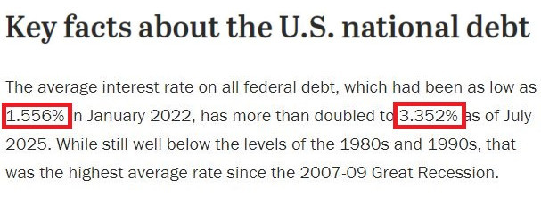 △美國皮尤研究中心的調查顯示,美聯邦債務的平均利率在美聯儲激進加息前的2022年1月曾低至1.556%,而到今年7月已翻了一倍多,達到3.352%,也是自2007-2009年大衰退以來的最高平均利率水平。