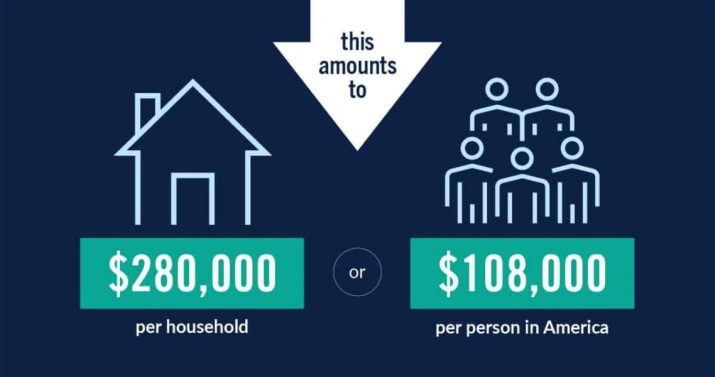 彼得森基金會給出驚人結果:如果將債務分攤給美國民眾,相當于每戶家庭負債28萬美元,每個人負債10.8萬美元。