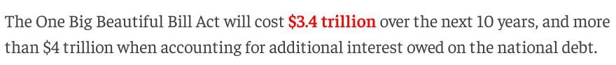 根據美國國會預算辦公室(CBO)上月做出的評估,“大而美”法案預計將在未來十年使美聯邦政府財政赤字增加約3.4萬億美元;如果算上同期的額外美債利息,新增赤字更是將超過4萬億美元。