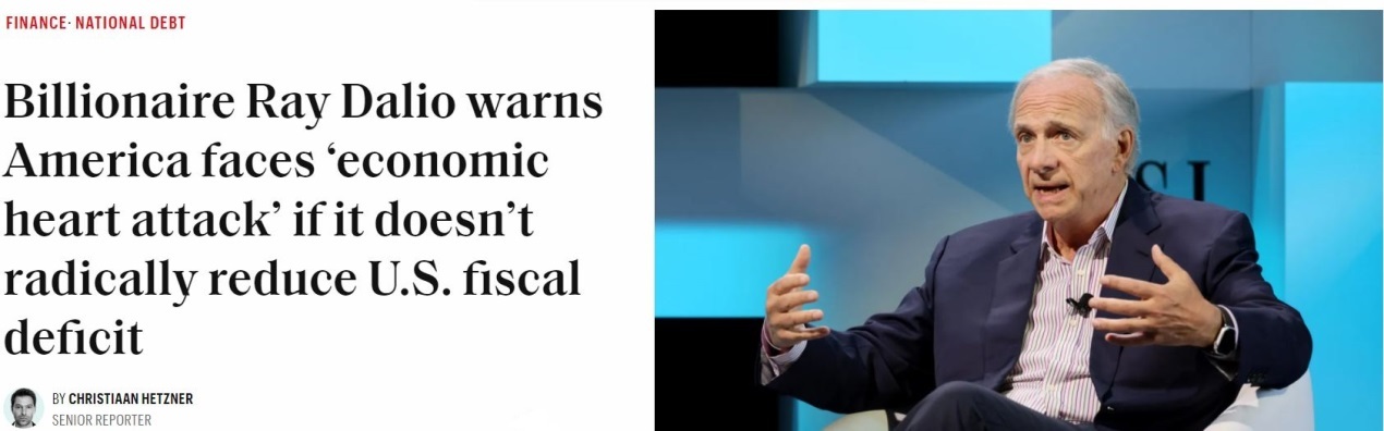 美國橋水基金創(chuàng)始人達利歐此前更是警告,如果不能有效控制財政赤字和債務規(guī)模,美國經濟遲早會“心臟病發(fā)作”。