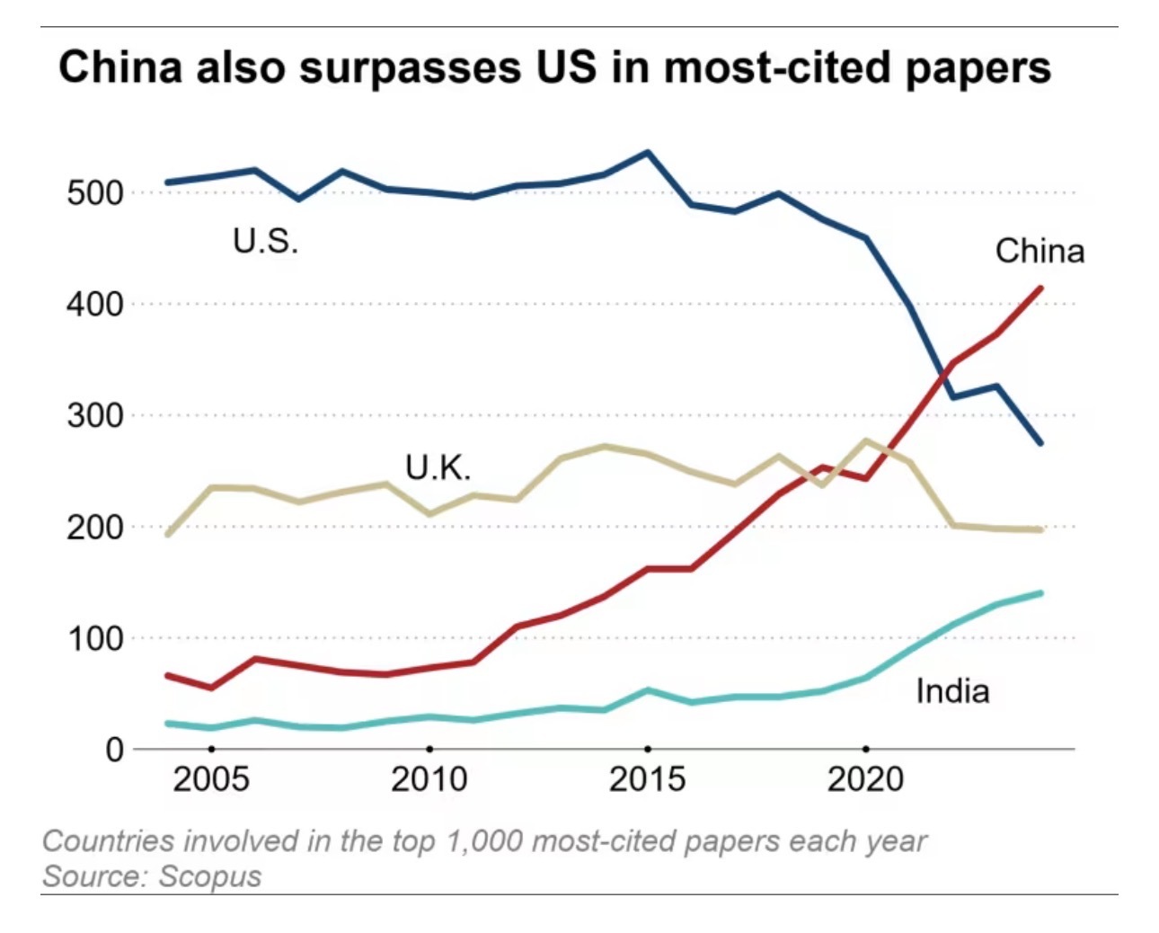文章表示,中國氣候變化研究論文在其他文獻(xiàn)中的引用次數(shù)也在顯著增加——這是研究質(zhì)量的一個重要標(biāo)志。從2004年到2024年,每年被引用次數(shù)最多的1000篇論文中,中國在2022年超越美國,占據(jù)了領(lǐng)先地位。
