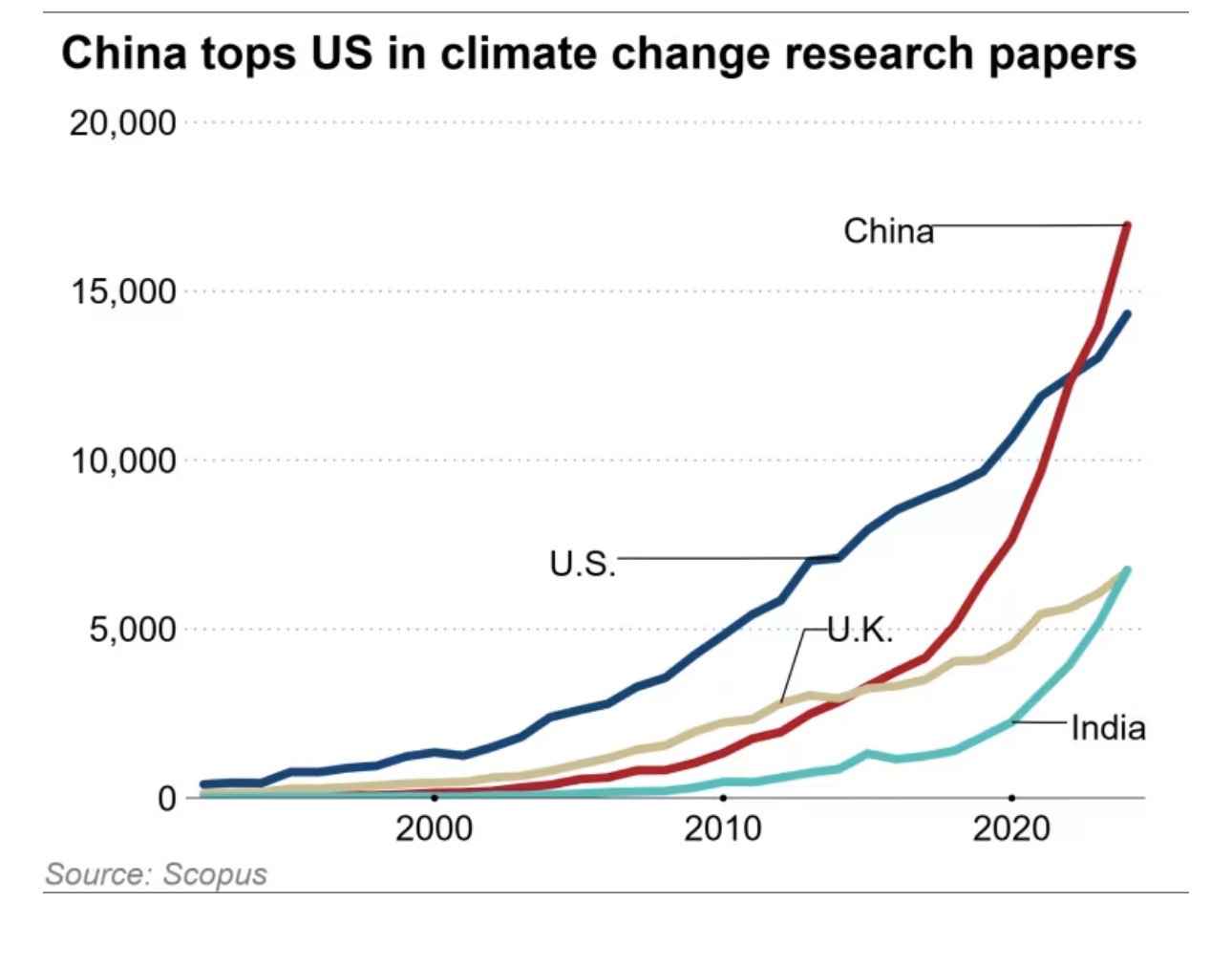 文章說,2023年,中國研究機(jī)構(gòu)發(fā)表了約1.4萬篇氣候變化研究論文,而美國機(jī)構(gòu)的論文數(shù)量為1.3萬篇。2024年,這一差距進(jìn)一步擴(kuò)大。當(dāng)年全球發(fā)表的7.7萬篇氣候相關(guān)論文中,中國貢獻(xiàn)了約1.7萬篇,而美國的論文數(shù)量僅為1.4萬篇左右。