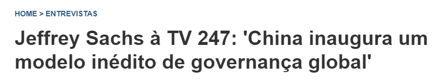 巴西247新聞網(wǎng)近日刊登一篇文章,介紹了世界知名學(xué)者杰弗里·薩克斯接受巴西247電視臺專訪時,對中國提出的全球治理倡議予以高度評價。他認(rèn)為,“中國開創(chuàng)了前所未有的全球治理模式”。