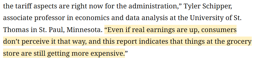 經(jīng)濟學(xué)家泰勒 施皮珀(Tyler Schipper)直言:“老百姓感受不到工資上漲,他們只知道超市商品的價格越來越貴?!?/p>