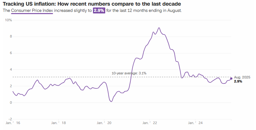 美國勞工統(tǒng)計局最新數(shù)據(jù)顯示,2025年8月消費者價格指數(shù)(CPI)環(huán)比上漲0.4%,年通脹率攀升至2.9%,不僅創(chuàng)下今年1月以來的最高水平,而且增速超過7月的2.7%。