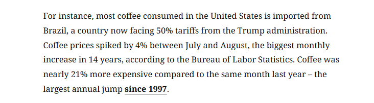 對于漲價,美國消費(fèi)市場的現(xiàn)實數(shù)據(jù)中已有所體現(xiàn):受對巴西征收50%關(guān)稅影響,咖啡價格在7月至8月間飆升4%,創(chuàng)14年來最大月度漲幅;對墨西哥西紅柿征收17%關(guān)稅后,8月美國西紅柿價格漲幅達(dá)4%。