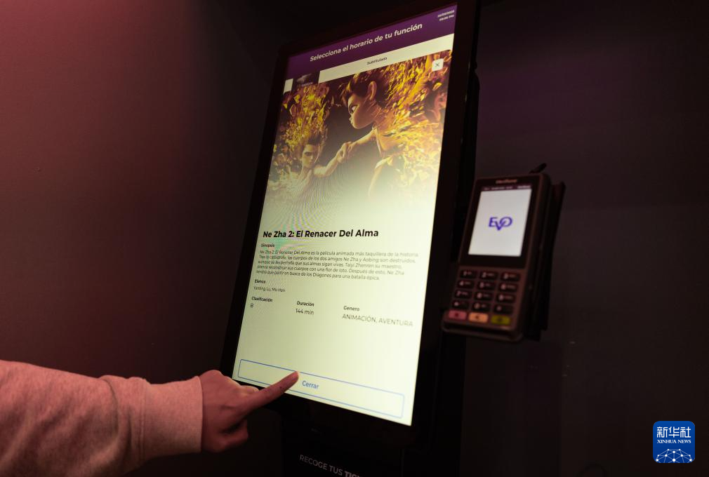 9月25日,在墨西哥首都墨西哥城的一家電影院,觀(guān)眾在自動(dòng)售票機(jī)上購(gòu)買(mǎi)《哪吒2》電影票。新華社記者 李夢(mèng)馨 攝