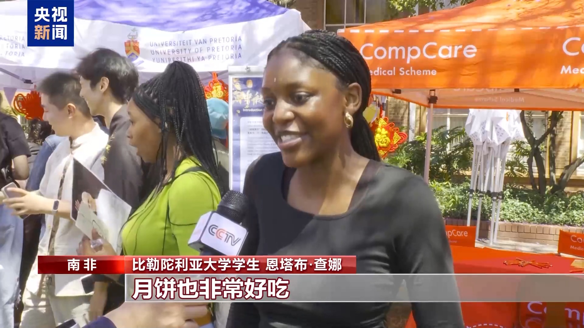 南非比勒陀利亞大學(xué)學(xué)生 恩塔布·查娜:中秋節(jié)讓我覺(jué)得很溫馨,這是我第一次看到中國(guó)人穿漢服。我品嘗了中國(guó)茶,一切都很棒,月餅也非常好吃。