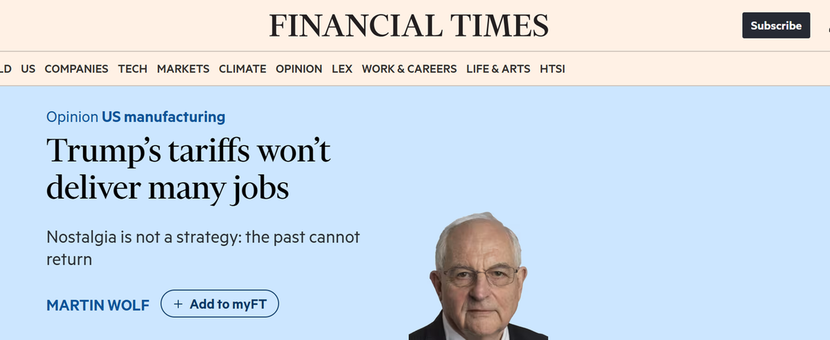 英國(guó)《金融時(shí)報(bào)》副總編及首席經(jīng)濟(jì)評(píng)論員馬丁·沃爾夫(Martin Wolf)8日發(fā)表評(píng)論文章稱(chēng),事實(shí)表明,特朗普政府推行的貿(mào)易保護(hù)主義政策,并未兌現(xiàn)其對(duì)選民所作的核心承諾——為美國(guó)創(chuàng)造大量制造業(yè)就業(yè)崗位,尤其是面向那些曾經(jīng)依賴(lài)傳統(tǒng)工業(yè)、如今卻面臨地區(qū)經(jīng)濟(jì)衰落困境的工人群體。他進(jìn)一步指出,這一承諾本質(zhì)上是空洞的,其政策實(shí)質(zhì)是為政府自身及其背后的富豪階層牟取利益。