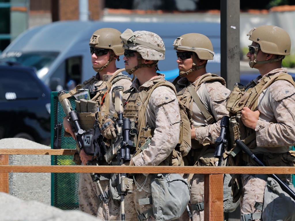 2025年6月13日,美國(guó)海軍陸戰(zhàn)隊(duì)士兵在洛杉磯威爾希爾聯(lián)邦大樓的入口處站崗。新華社發(fā)(邱晨攝)