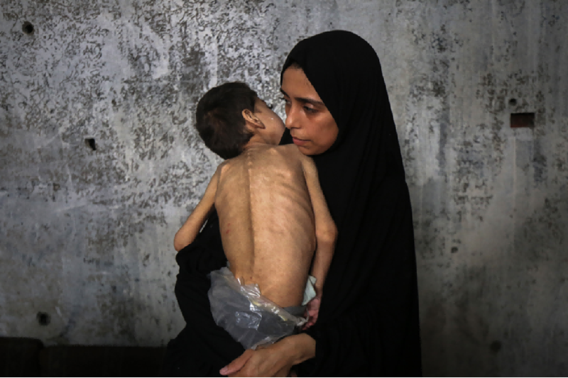 7月25日,在加沙城一處避難所,一名女子懷抱營(yíng)養(yǎng)不良并患病的兒童。新華社發(fā)(里澤克·阿卜杜勒賈瓦德攝)